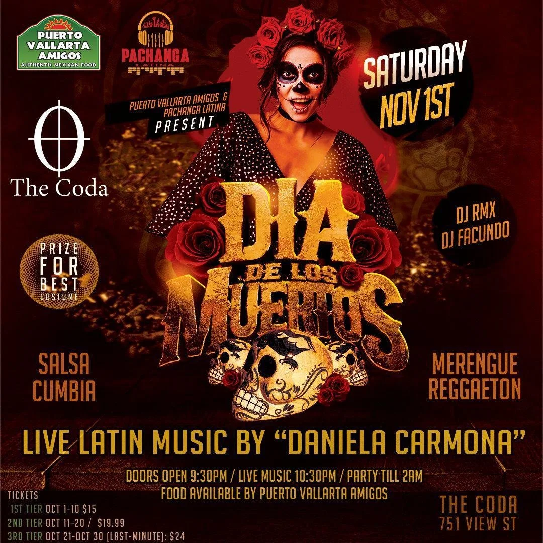 Step into a night where music, memory, and tradition collide. Join us at The Coda for an electrifying Día de los Muertos celebration featuring the passionate rhythms of Danny Carmona y su banda, plus two dynamic Latin DJs keeping the dance floor alive all night long.